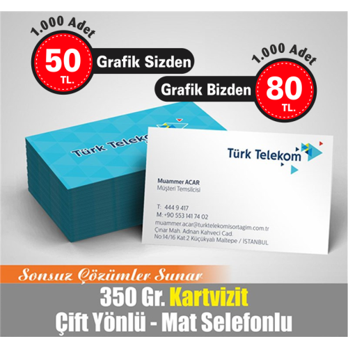 Mat selefonlu kartvizit baskı süremiz 3 iş günüdür. Çift taraflı Mat selefonlu kartvizitler 350 gr parlak kuşeye basılmaktadır. Çift taraflı Mat selefonlu kartvizitlerin ölçüleri 52 mm x 82 mm dir.